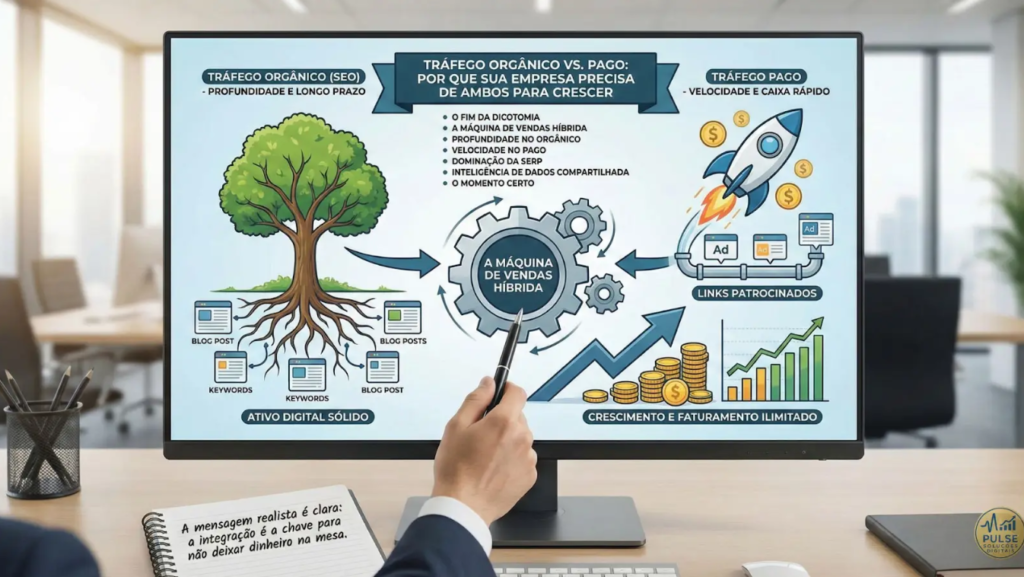 - O Fim da Dicotomia: Entenda por que escolher entre orgânico e pago é um erro estratégico que limita seu faturamento.